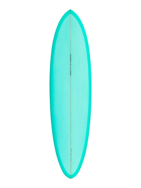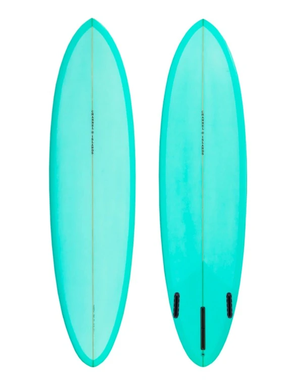The CI Mid is a modern classic design resulting from a fun collaboration with Devon Howard, a southern California surfer that has spent the past two decades riding and refining egg-inspired designs that are in a category of boards many refer to as midlengths. Inspired by the clean, longer-railed lines drawn by traditional eggs and single-fins, the CI Mid infuses that timeless vibe with the crispness, sensitivity, and freedom made possible by modern features synonymous with Merrick design principles. Boasting a sleek, egg-like template with low entry rocker and foam a tad forward for ease of paddle and effortless trim speed, the CI Mid scoots, squirts and swivels thanks to contemporary features like double-barrel concave, gradually accelerated rocker, and hard, slightly tucked rails through and off the tail. A reliable all-arounder that flies over the flatter, smaller stuff, the CI Mid really stands apart from other eggs and various midlength designs out there, especially in shoulder-high to nearly double overhead point surf-where surfers are able to lay down flowy, arcing turns with total confidence, speed, and control. The minimalist logo is out of the Channel Islands Archives-a lam Al put on his boards in the early ’70s-all CI Mids are stocked with high quality, colorful resin craftsmanship (6-4oz. decks with 6oz. bottoms). We’ve also designed an all-new custom 2+1 fin template for this board with our neighbors and friends at True Ames Fins in Goleta, California.