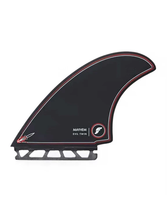 “The Evil Twin” is a new Twin Fin + trailer combo developed not just for the “Evil Twin” board model, but for any boards that revel on twin fin flare. The template is an exact replica of our twin fins designed for our original RNF close to 25 years ago. A friend in Florida recently dug up an actual mid 90’s pair of these hand foiled twins and sent them to me, claiming these large surface area fins relevance today. We immediately prototyped with Futures and loved them. An upright fin, with a swept back tip, and plenty of area. They provide drive and precise pivot. We paired them with a smaller than average trailer, which helps draw out turns and lends some stability and projection, yet retains that free feeling, twin fin feel. “I recently used a prototype set on my step-ups, solid backside, overhead Indo surf, where I never thought a twin fin would perform so well, I would actually forget I was using them” -Mayhem